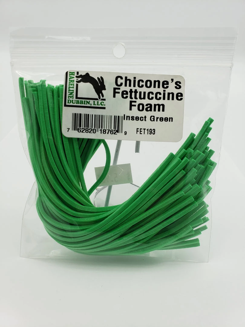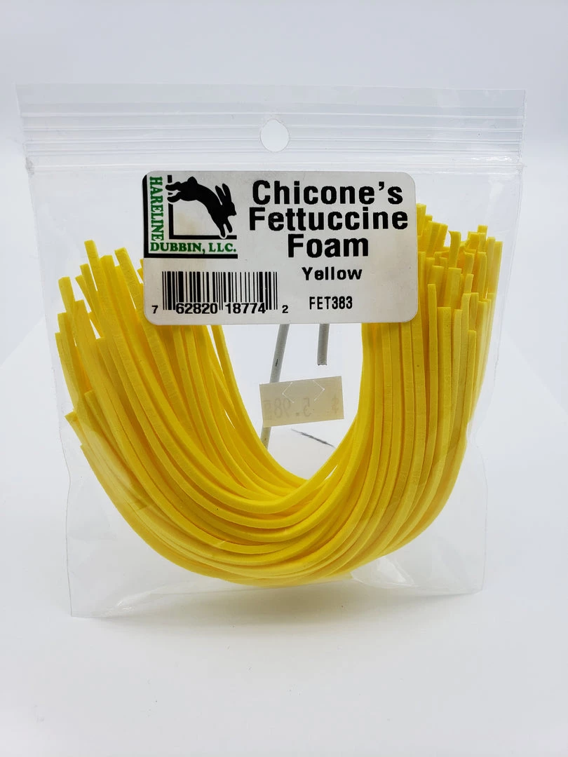 Chicone’s Fettuccine foam comes in thin pre-cut pieces. It works well for anything from legs on bass flies, to tails , wraps on fly bodies. A versatile addition to your fly-tying supplies.
