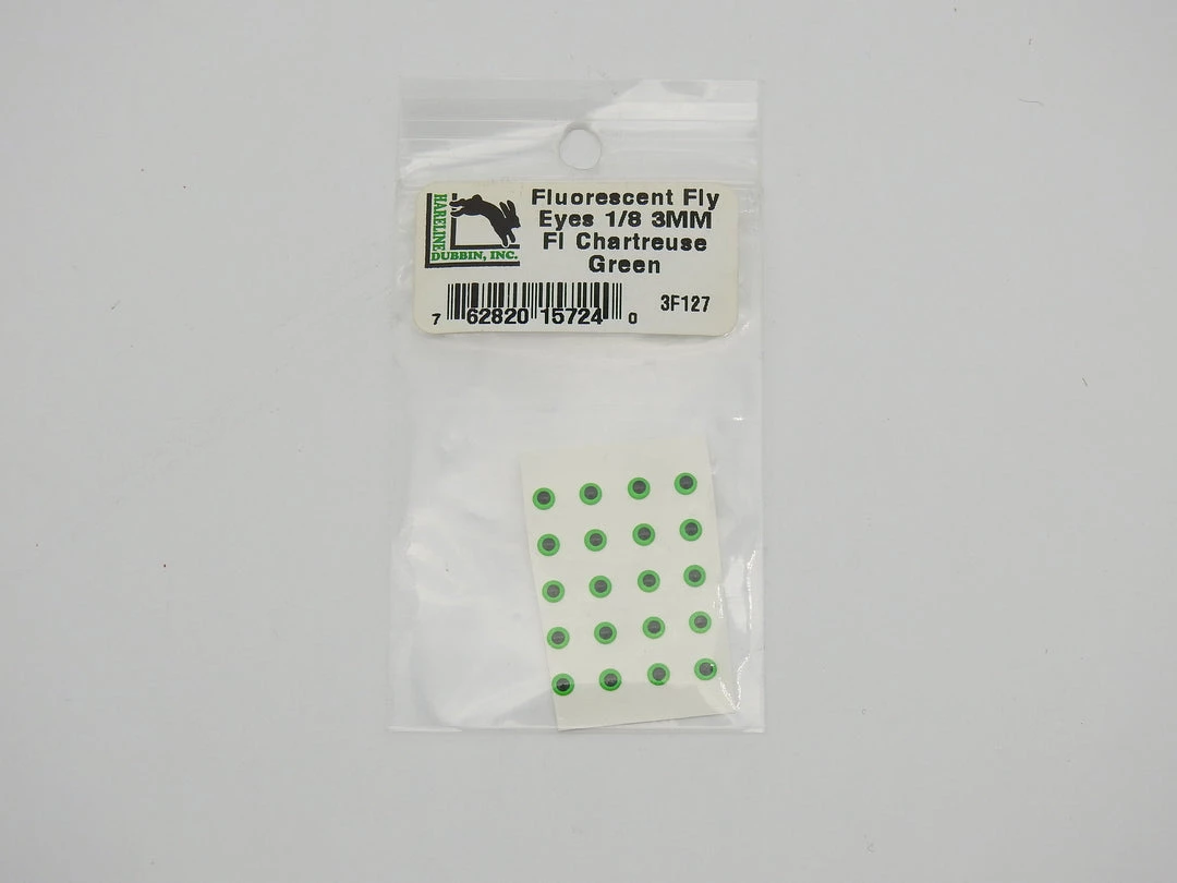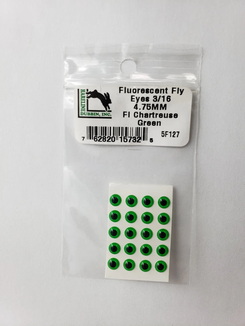 Fluorescent Fly Eyes are sticky eyes that you can stick on to your dumbell eyes. They have a nice fluorescent shine to them that makes them look very realistic. They are a great addition to Clouser minnows, sculpins or other baitfish patterns.